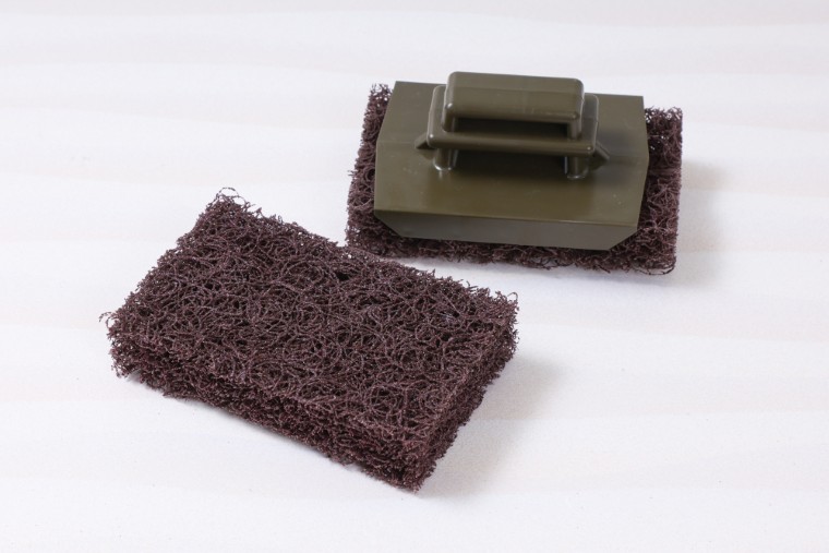 電動工具がない場合のおすすめツールがハンドル付きの研磨タワシです。研磨タワシは研磨材を塗布した太いナイロン不織布でできていて、サンドペーパーに比べると耐久性が高く目詰まりもしにくいのが特長。ハンドルをしっかりつかめるため、研磨面に効率よく力を伝えることができます。粗目から中目程度までがそろっているので、作業工程に合わせて使い分けてください。
