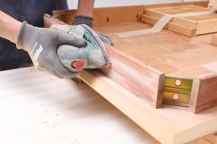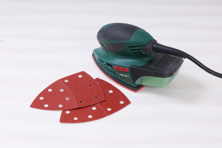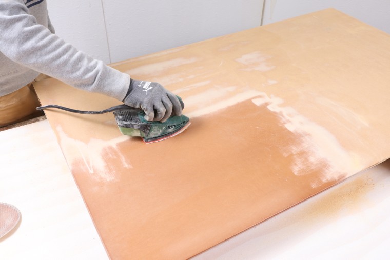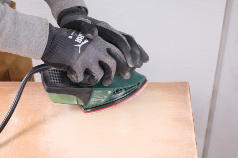 硬いウレタン塗膜はサンドペーパーでは簡単に削り落とすことができません。天板などの広い面を効率よく研磨するためには、力を掛けやすいハンドツールや電動工具を使いましょう。