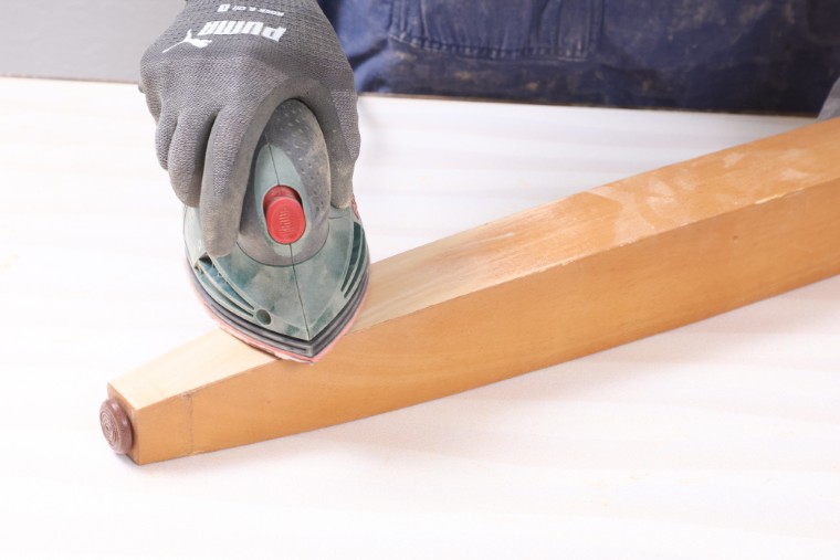 天板の裏面や側面、幕板、脚などの塗り替える部分も研磨して古い塗膜を削り落とします。
