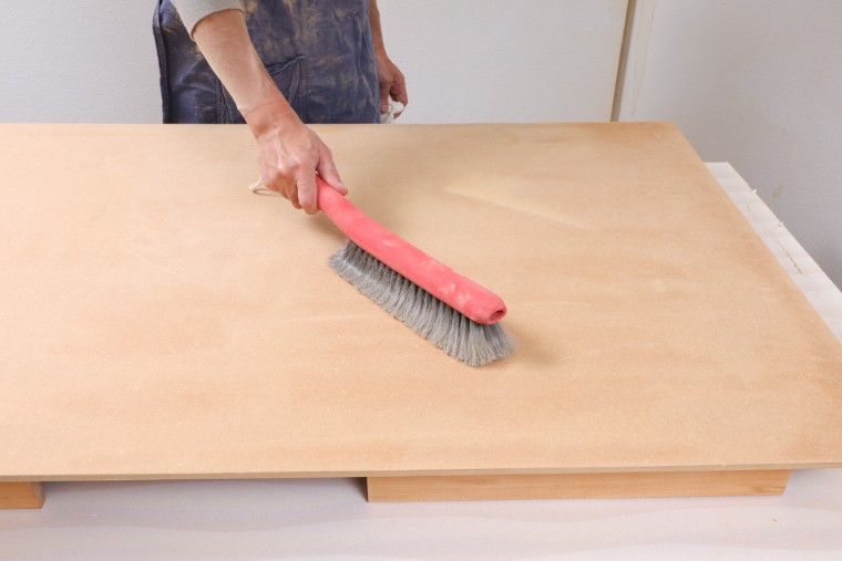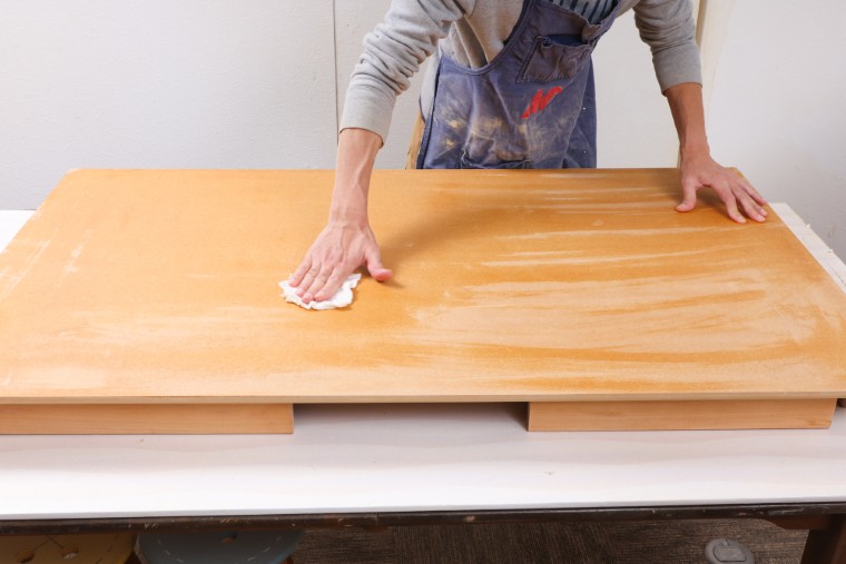 研磨をすると木材の表面にたくさんの削りカスが残ります。これをきれいに取り除かないと新しい塗料に混じってしまうので、ブラシやハケで掃いたあと濡れたウェスを使ってていねいに拭き取りましょう。