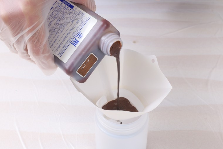 主剤をよく振って撹拌してから付属のフィルターを使って半量をシェーカーに移します。