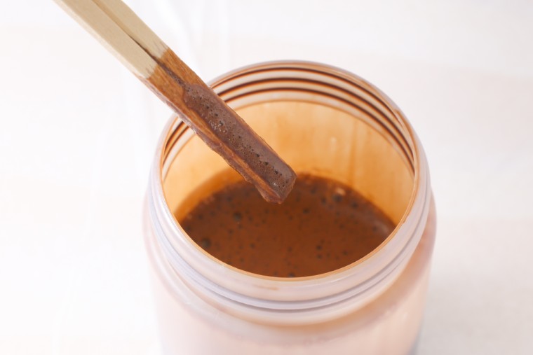 割りばしなどで塗料をすくい取って均一に混ざっているかを確認します。混ざり方にムラがなくなるまでよく混ぜ合わせましょう。