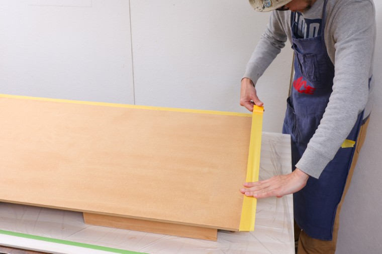 天板の側面や裏面を塗るときは、塗料が垂れるのを防ぐために表面側の縁をマスキングテープで養生します。
