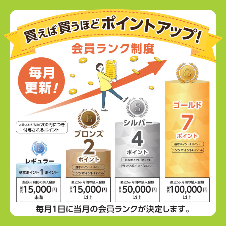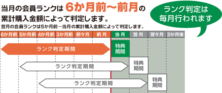 会員ランクは直近6か月間の累計購入金額(税抜)に応じて、毎月1日に更新されます。