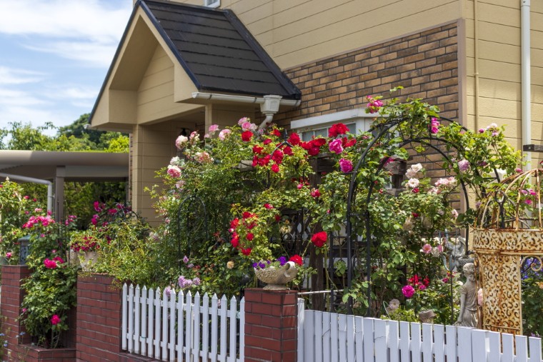 玄関までのアプローチがあれば、フェンスやトレリスを利用すると、通行の邪魔にならずにボリュームのある花を楽しむことができます。つる性のバラは春にはたくさんの花をいっせいに咲かせて、アプローチを華やかに彩ります。