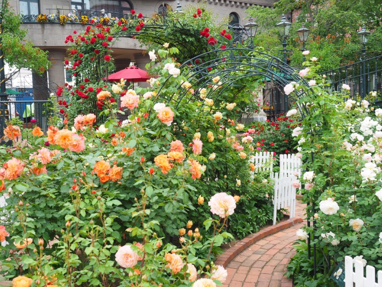 スペースに余裕がなければ、木立性のバラを鉢植えで管理します。花後や休眠期に季節の花と入れ替えて、植栽全体のコントロールをすることもできます。