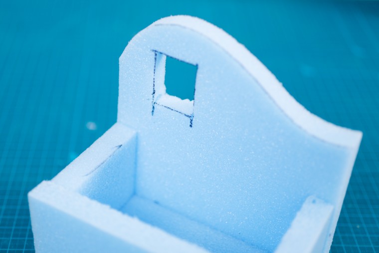 全体の組み立てができたら、背面の上部を曲線にカットしてエレガントな門壁の印象を出します。