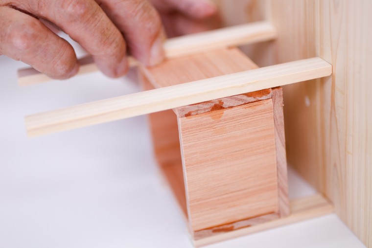 脚になるヒノキ材をノコギリでカットし、座面に取り付けます。前脚を取り付けた後に、後脚を取り付けます。