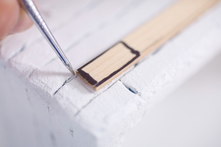 幅10mmの工作材を使い、千枚通しなどの先端が尖った道具でレンガの厚み分の筋を刻んで、目地のようにします。