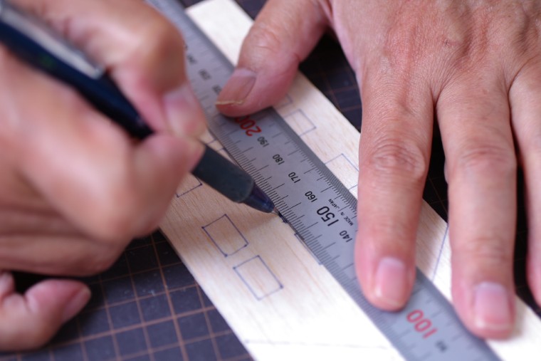 窓が描けたら、バルサ材をカットし前後と、左右の長方形の壁を作ります。