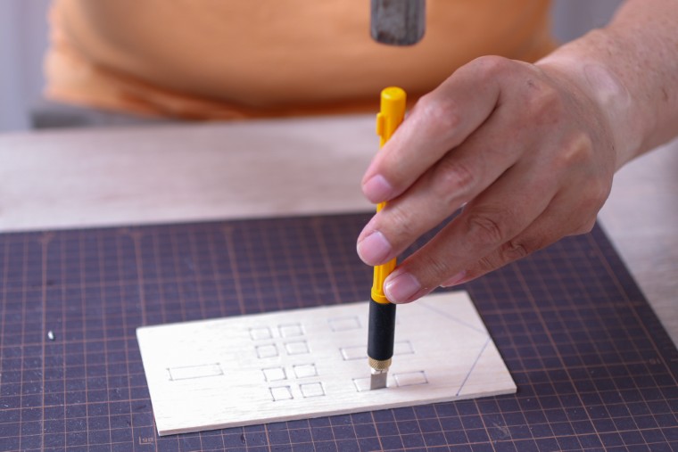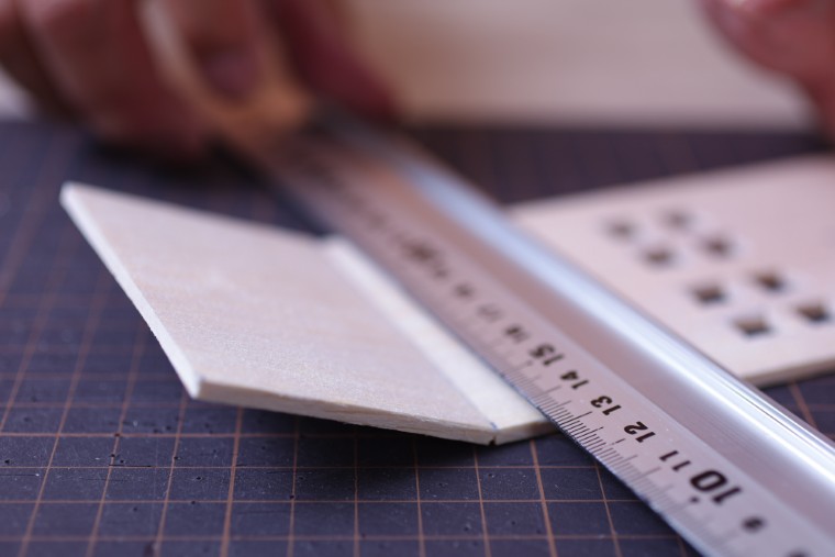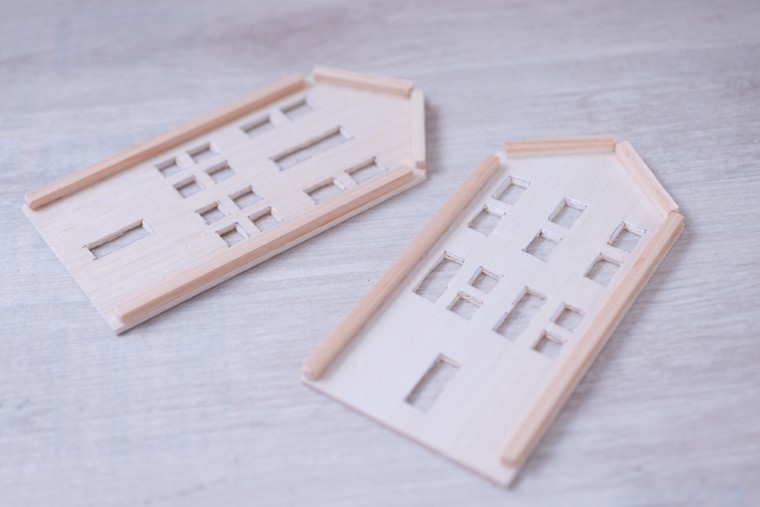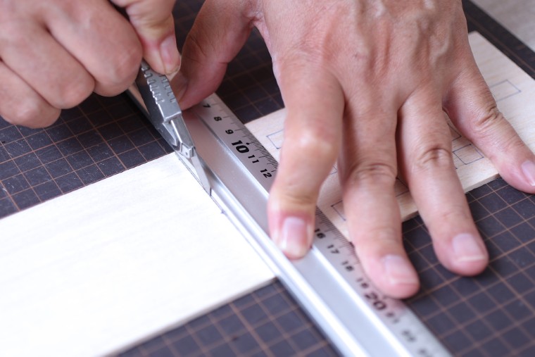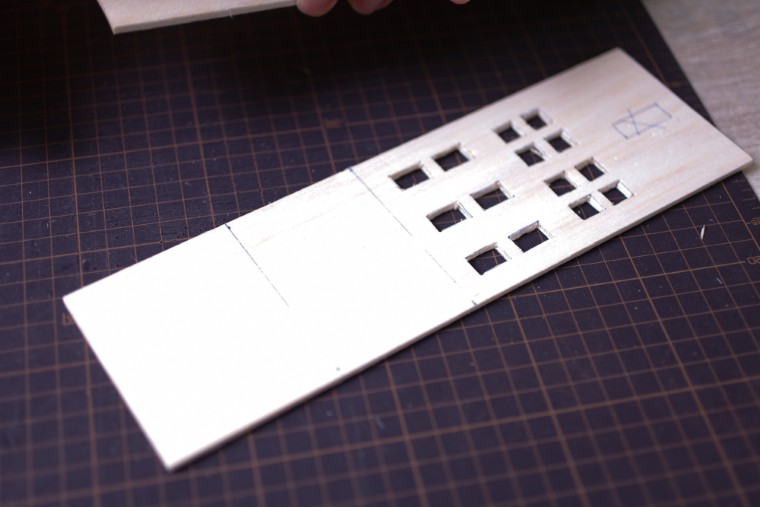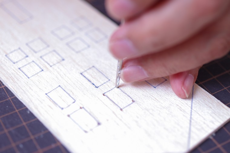 バルサ材をカットしたら、次にそれぞれの壁に描いた窓と出入り口の穴を切り抜いていきます。