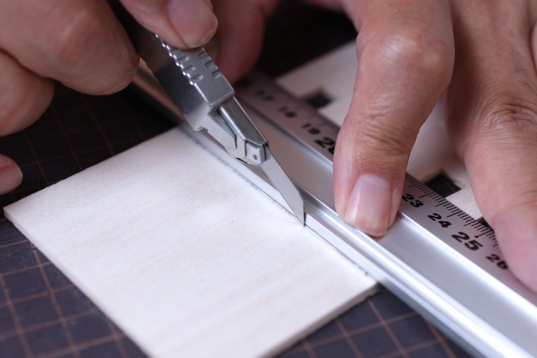 バルサ材は繊維が残りやすいので、刃で押し切るようにしっかりたたいてカットします。