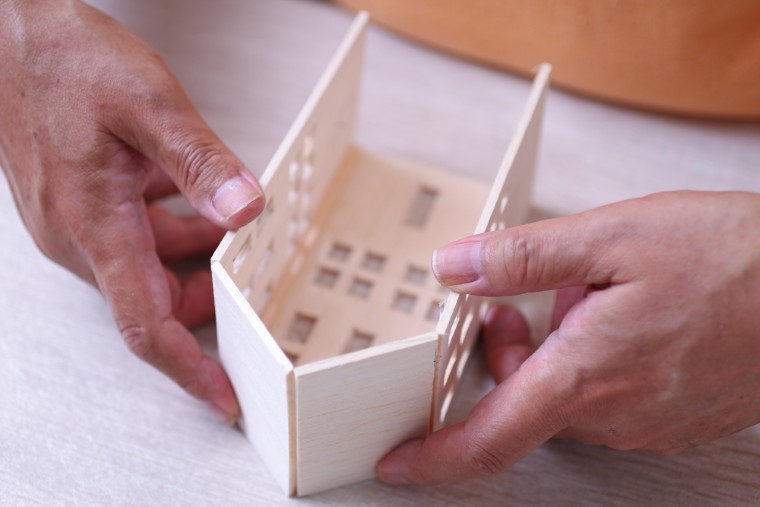 前後の壁に左右の壁を接着して、屋根の部分も軽く曲げながら接着し家の形を組み上げます。