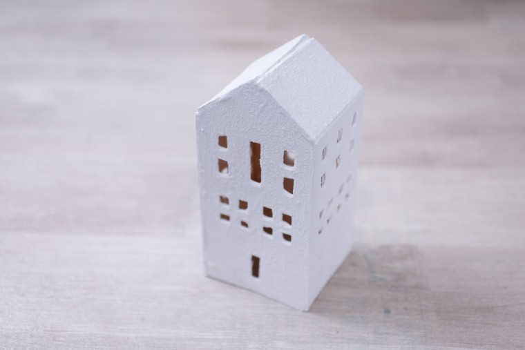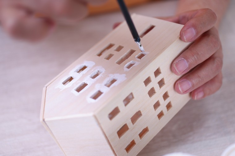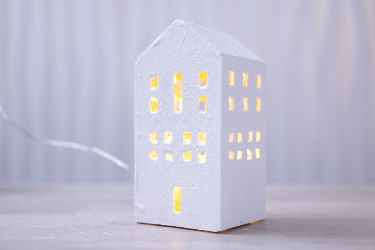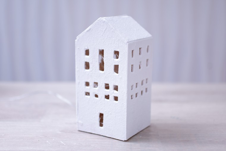 接着剤を使って箱状に組み立て、表面に漆喰風塗料を塗り、家の中に市販のLED ストリングライト押し込んだら完成です。