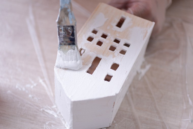 例えばカッターでカットできるバルサ材と、漆喰風の塗料の組み合わせで、このような小さなおうち風ランプも簡単に作れます。