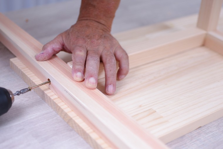 次に、先にカットしテーパー加工を施していた背フレームを同じようにダボ穴をあけてからネジ打ち固定します。