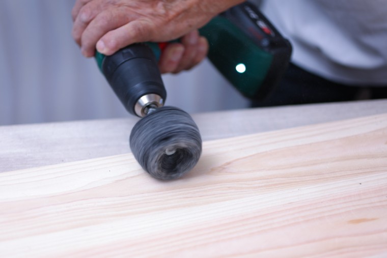 カップワイヤーを電動ドリルドライバーに取り付け、板材をクランプで固定したら、表面を適度に荒らします。