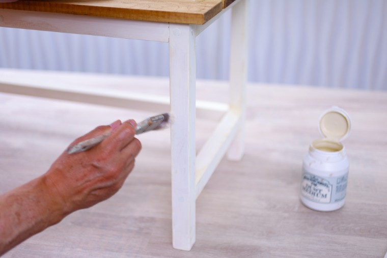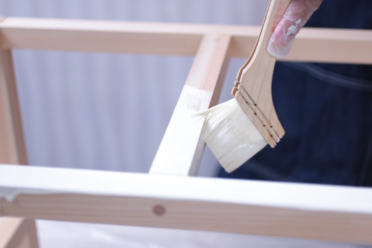 使い古したハケの先端をハサミでカットし、ミルクペイントダストメディウムを少量とって、キッチンペーパーなどで軽くこすり取ってから、塗装したフレームに薄くかすれるように塗布します。