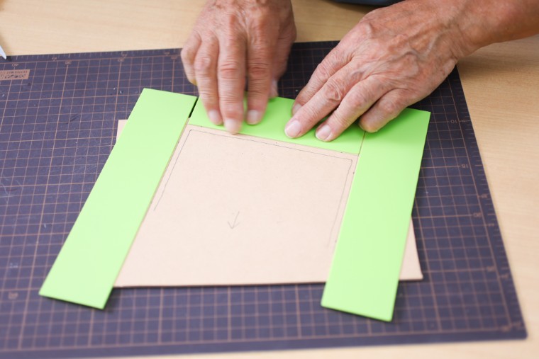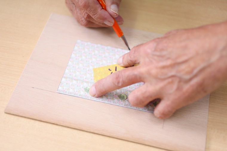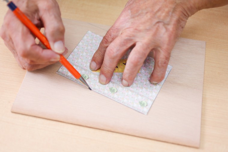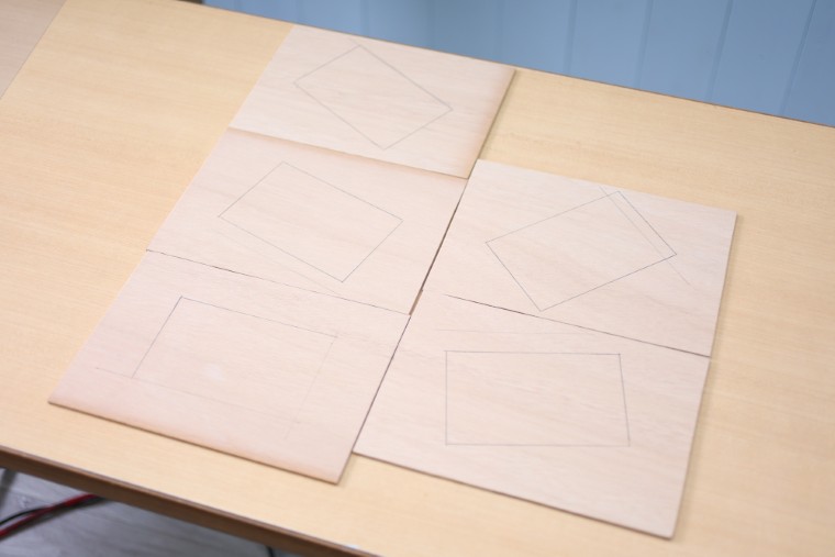 裏板に窓の位置を写すため、表板を重ねた状態で窓枠に沿って線を引きます。