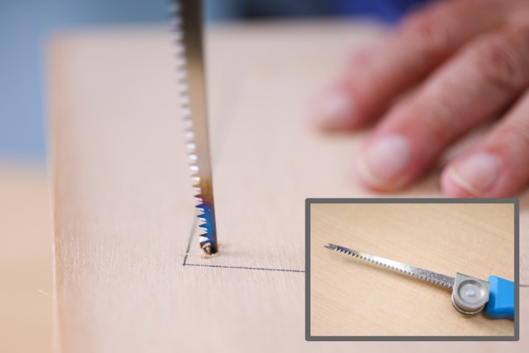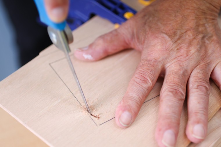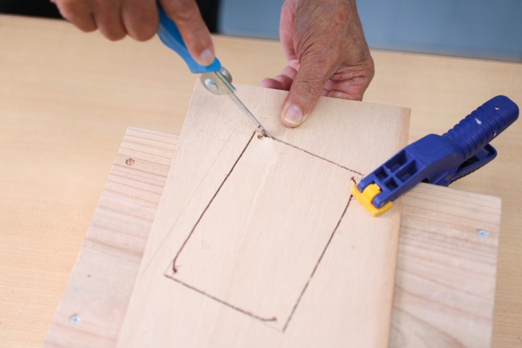 十分な大きさの穴があいたらそこからノコギリを差し込んで、線の内側に沿って直線を切っていきます。角まで切ったら、新たに穴あけて残りの直線を切りましょう。