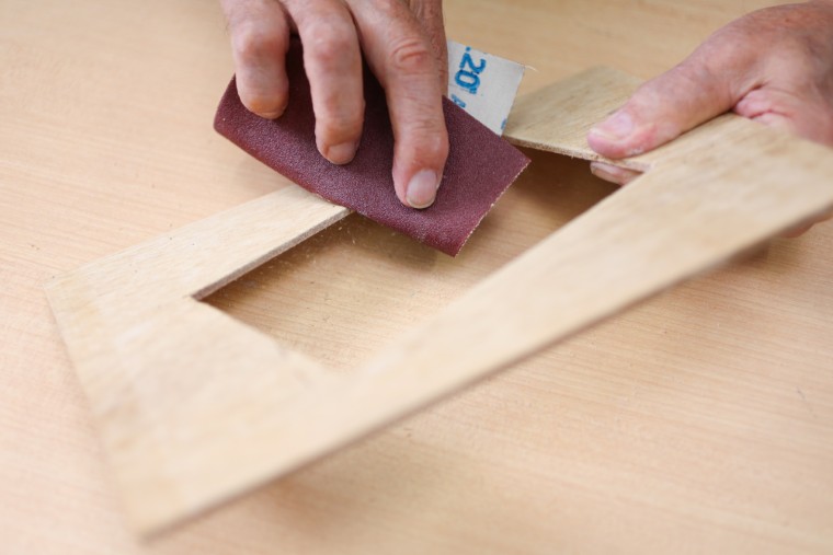 板の外側と抜いた窓の内側を80番程度の粗目のサンドペーパーで磨いて、指に引っかかるところがないように均しておきましょう。