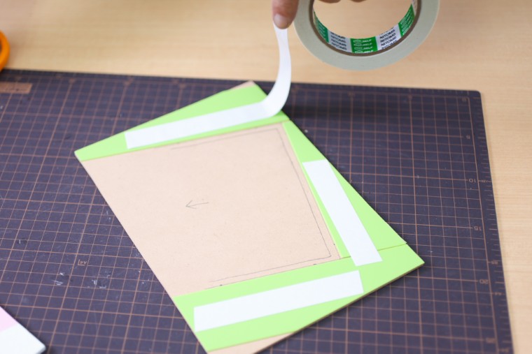 裏板は先ほど引いた線の5mm外側にもう1本の線を引き、その線に重ねないように両面テープでスペーサーを貼ります。