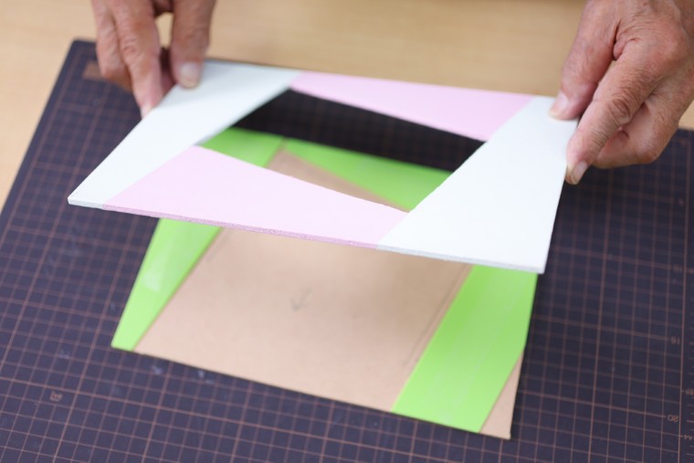 裏板からはみ出したスペーサーを板の縁に沿ってカッターで切り落とし、スペーサーの表面に両面テープを貼ります。