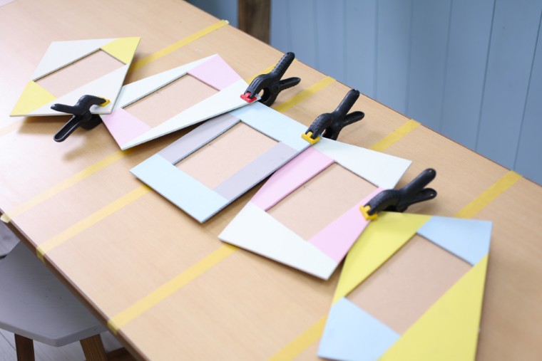 連結は、フレーム同士が重なるところに木工用接着剤を塗ってクランプではさんで圧着します。 このまま接着剤が固まるまで1日おいて確実に接着してください。 しっかり接着できない場合は、裏側からネジを打って固定しましょう。