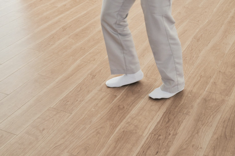 上から踏み込んでテープと床材を圧着します。