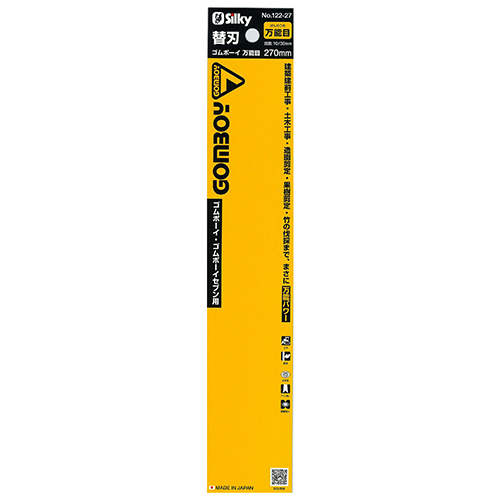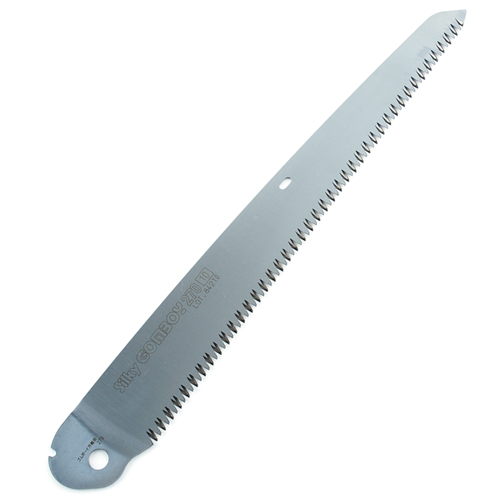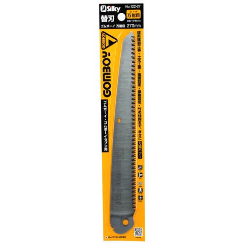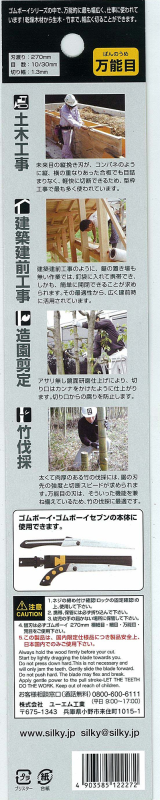 ●刃長:270mm(万能目)。●目数(30mm):10枚目。●刃厚:1.4mm。●切幅:1.3mm。●全長:300mm。●重量:65g。●アサリ無し・衝撃焼入・未来目。●ハードクロームメッキ。
