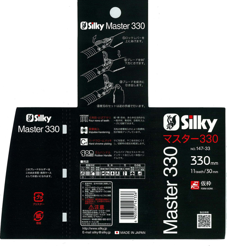 ●刃長:330mm。●目数(30mm):11枚目。●刃厚:1.0mm。●切幅:1.35mm。●全長:使用時685mm。●重量:295g。●4列目とびアサリ・衝撃焼入。●ゴムハンドル・ハードクロームメッキ。