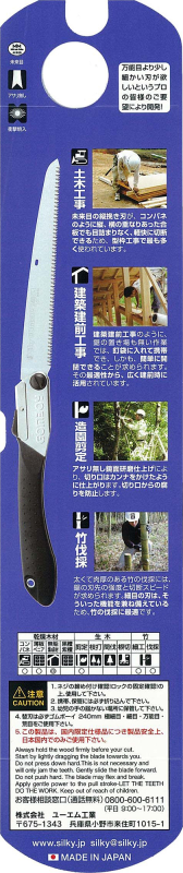 ●刃長:240mm(細目)。●目数(30mm):14枚目。●刃厚:1.3mm。●切幅:1.2mm。●全長:折込時270mm・使用時505mm。●重量:265g。●アサリ無し・衝撃焼入・未来目。●ゴムハンドル・ハードクロームメッキ。