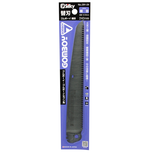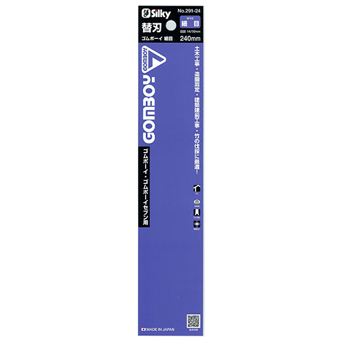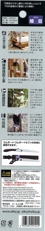 ●刃長:240mm(細目)。●目数(30mm):14枚目。●刃厚:1.3mm。●切幅:1.2mm。●全長:270mm。●重量:50g。●アサリ無し・衝撃焼入・未来目。●ハードクロームメッキ。