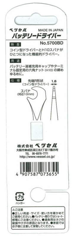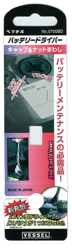 見る角度で色が変わるメタルライングリップです。刃先は刃幅18mmのマイナスドライバーに対辺10mmのスパナを合体させた新形状になっています。1本でバッテリーメンテナンスが行えます。