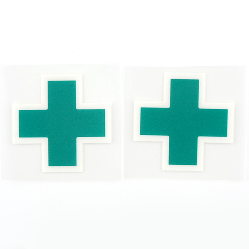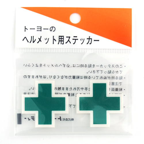 白外枠付き反射緑十字シールです。緑地・白枠共に反射するので濃い色のヘルメットによく目立ちます。