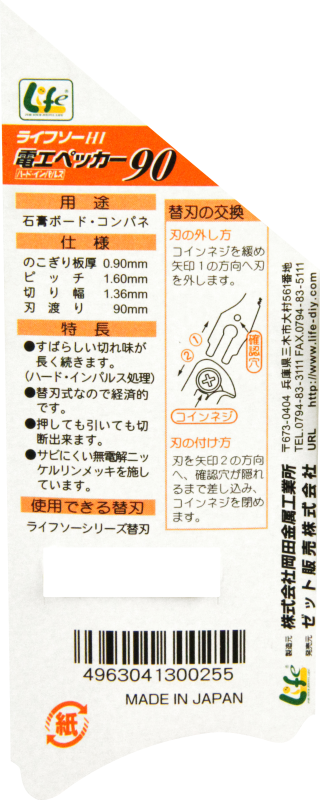 ●刃長:90mm。●ピッチ:1.6mm。●板厚:0.9mm。●切幅:1.36mm。