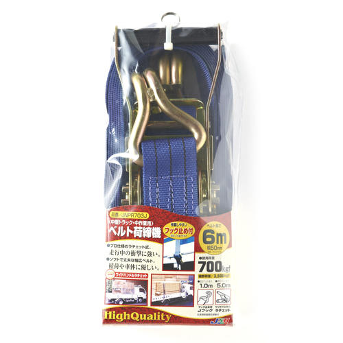 ●ベルト幅:50mm。●ベルト長:巻取5m。●ベルト長:固定1m。●使用荷重:700kg。●破断荷重:3500kg。●端末:Jフック。