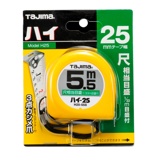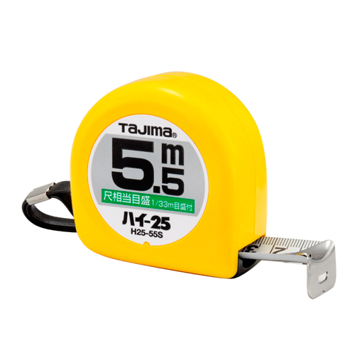 ●目盛仕様:尺相当目盛。●テープ幅:25mm。●テープ長さ:5.5m。●ヨンゴーゴーピッチ表示付。●ストラップ付。●大型ベルトクリップ付。●爪飛び防止用プロテクター付。●0点補正移動爪。