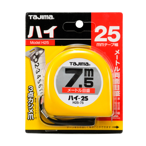 ●目盛仕様:メートル目盛、JIS1級、両面目盛。●テープ幅:25mm。●テープ長さ:7.5m。●ヨンゴーゴーピッチ表示付。●ストラップ付。●大型ベルトクリップ付。●爪飛び防止用プロテクター付。