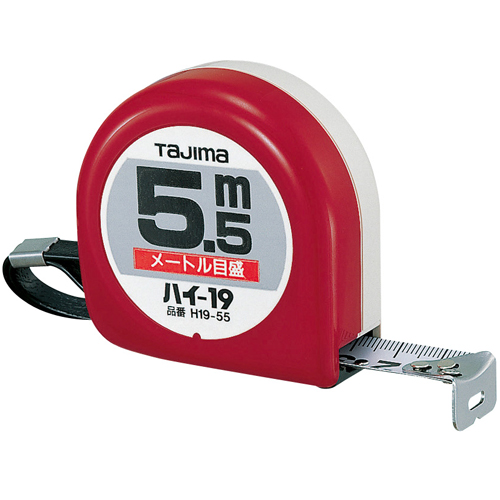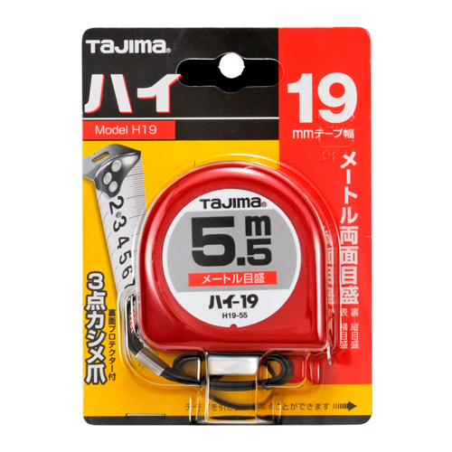 ●目盛仕様:メートル目盛、JIS1級、両面目盛。●テープ幅:19mm。●テープ長さ:5.5m。●ヨンゴーゴーピッチ表示付。●ストラップ付。●ベルトクリップ付。●爪飛び防止用プロテクター付。