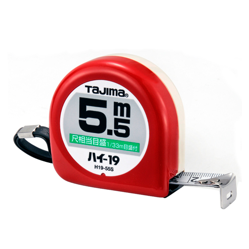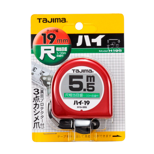 ●目盛仕様:尺相当目盛。●テープ幅:19mm。●テープ長さ:5.5m。●ヨンゴーゴーピッチ表示付。●ストラップ付。●ベルトクリップ付。●爪飛び防止用プロテクター付。