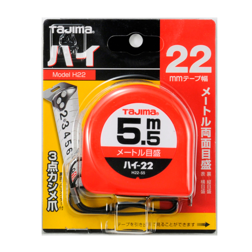 ●目盛仕様:メートル目盛、JIS1級、両面目盛。●テープ幅:22mm。●テープ長さ:5.5m。●ヨンゴーゴーピッチ表示付。●ストラップ付。●ベルトクリップ付。●爪飛び防止用プロテクター付。