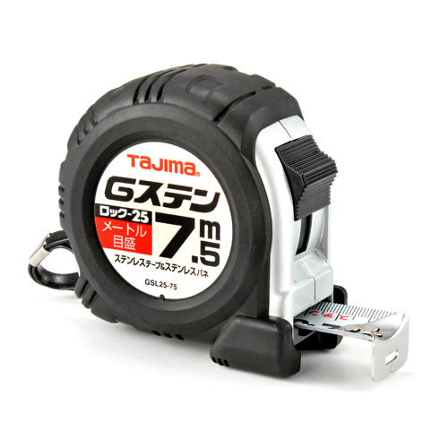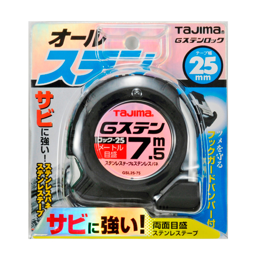 ●目盛仕様:メートル目盛、JIS1級、両面目盛。●テープ幅:25mm。●テープ長さ:7.5m。●ヨンゴーゴーピッチ表示付。●ストラップ付。●大型ベルトクリップ付。●爪飛び防止用プロテクター付。