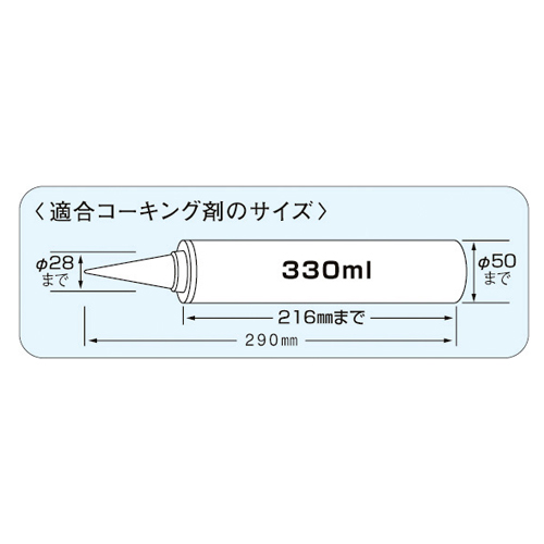 ●適合コーキング剤サイズ:筒長さ216mmまで。●適合コーキング剤サイズ:径50mmまで。●容量:330ml。●金属グリップ。