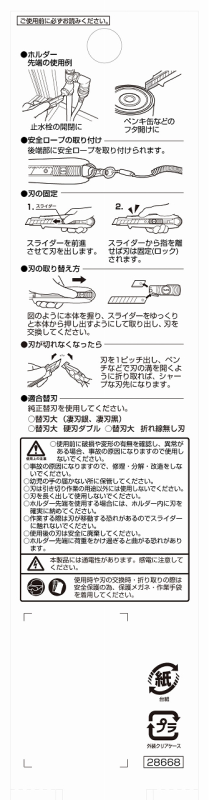 ホルダー全体に焼き入れしたステンレス鋼を採用しました。ドライバーと同等の硬度なので、ネジを締めたりつく、こじるが可能になりカッター本体を多機能工具として使用できます。ホルダー先端部が通常品より3.5倍の硬度でつぶれにくくて長持ちです。他色有ります。オートロック式(ロック力25キロ)です。