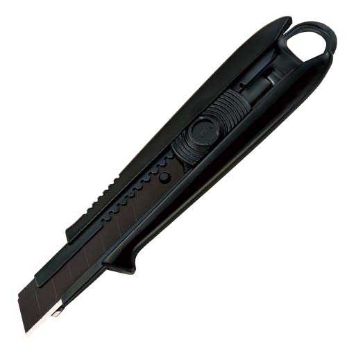 ●替刃タイプ:L型替刃(0.5mm厚×18mm幅)。●オートロック式。●安全ロープ取り付け環付き。●凄刃黒標準装備。