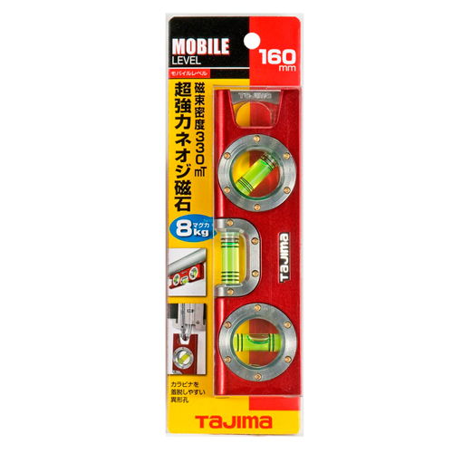 ●長さ:160mm。●気泡管:水平・垂直・45度。●指標線数:水平6本リング、垂直・45度4本リング。●気泡管精度:±1.5mm/1m(±0.0859度以内)。●蓄光シート。●磁束密度:約330ミリテスラ(mT)。●アルミダイカストボディ。●マグネット1個付。