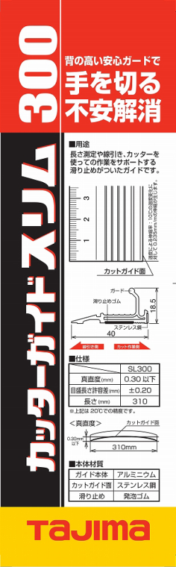 カッターから手を守る、高さ18.5ミリのガード付定規です。プロ用カッターガイドを幅40ミリにスリム化して事務・家庭用にアレンジしました。強度に優れた中空リブ構造を採用しています。ミリ単位の目盛付、定規として利用可能です。底面にすべり止めゴムを埋め込み安定した使用感です。