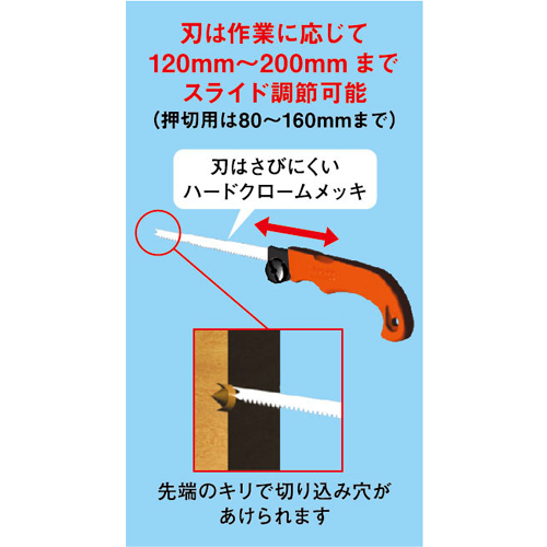 ●鋸目:荒目14山(寸目)。●刃渡り:200mm。●刃厚:1.2mm。●ハードクロムメッキ。