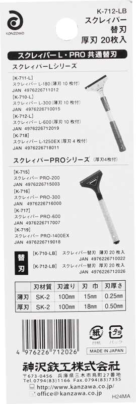 ●刃渡り:100mm。●刃巾:18mm。●刃厚:0.50mm。●厚刃20枚入。